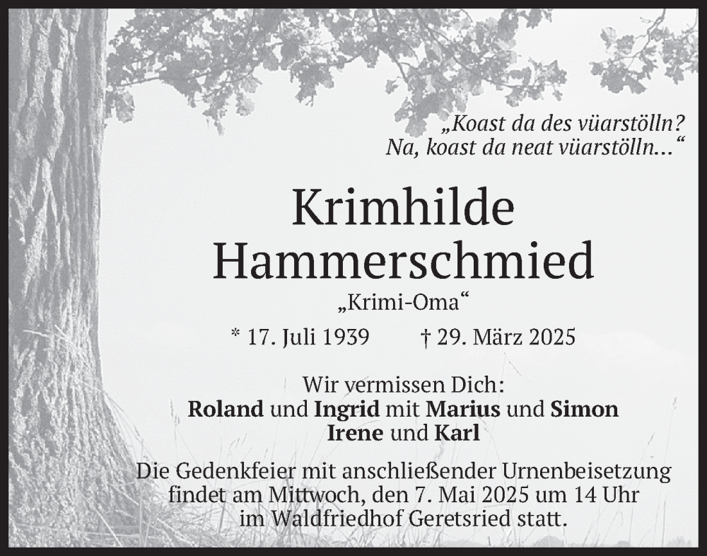Hier finden Sie alle Traueranzeigen aus der Zeitung, die bisher für Krimhilde Hammerschmied erschienen sind. Weitere Traueranzeigen, die in der Zeitung erscheinen, werden hier ebenfalls aufgelistet