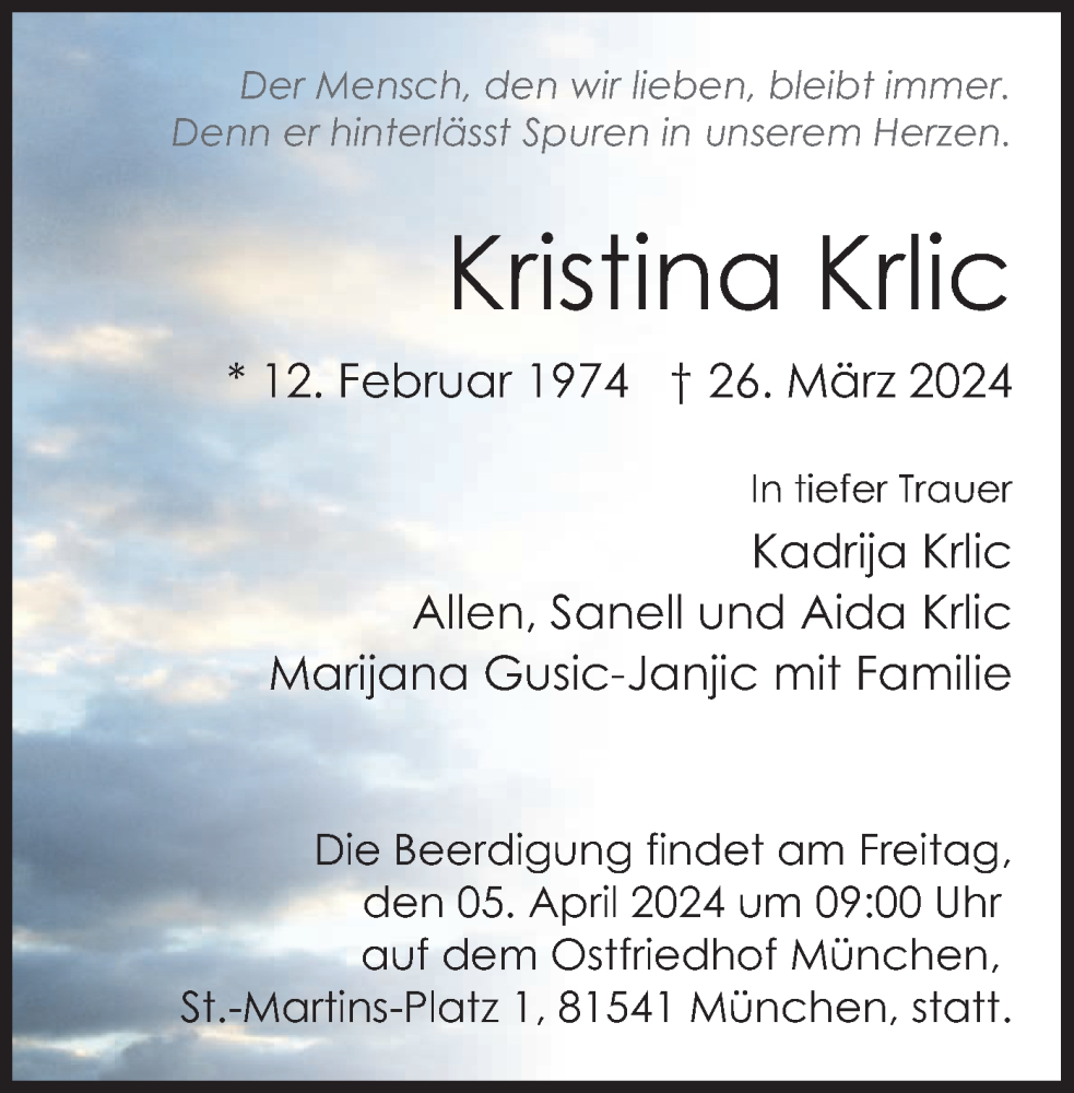 Hier finden Sie alle Traueranzeigen aus der Zeitung, die bisher für Kristina Krlic erschienen sind. Weitere Traueranzeigen, die in der Zeitung erscheinen, werden hier ebenfalls aufgelistet