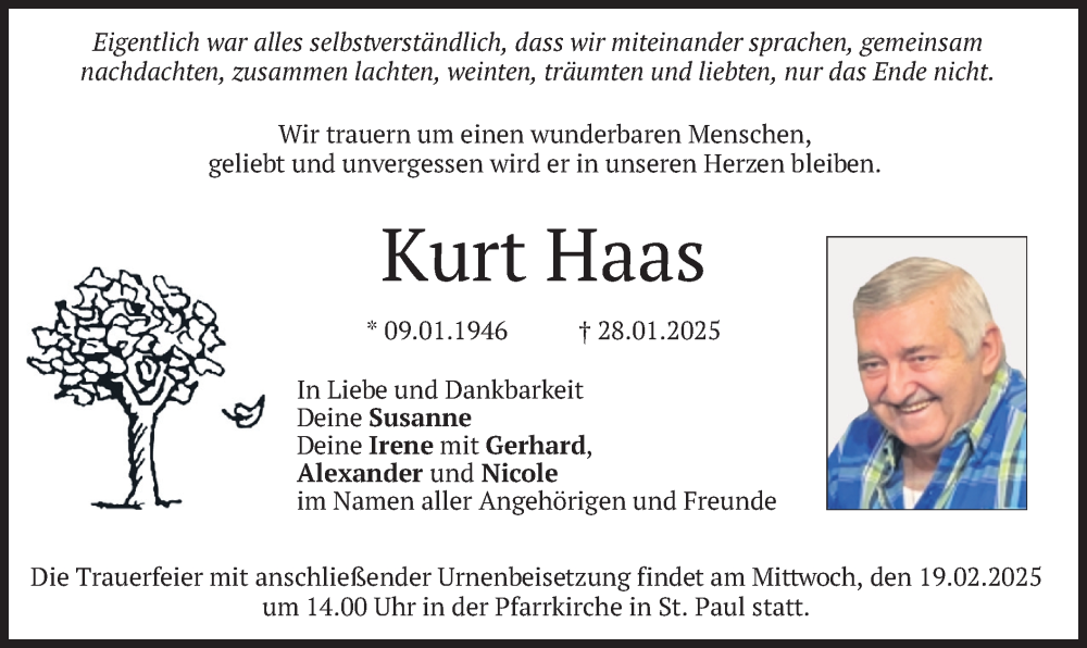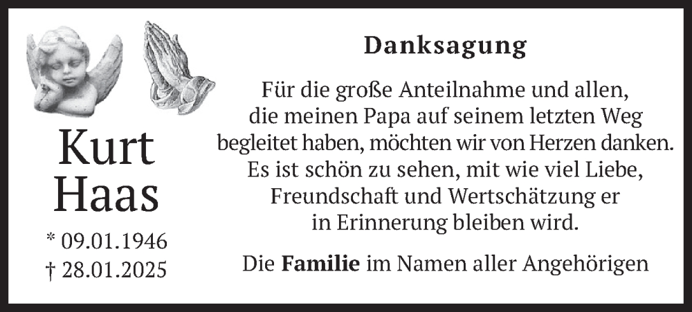 Hier finden Sie alle Traueranzeigen aus der Zeitung, die bisher für Kurt Haas erschienen sind. Weitere Traueranzeigen, die in der Zeitung erscheinen, werden hier ebenfalls aufgelistet
