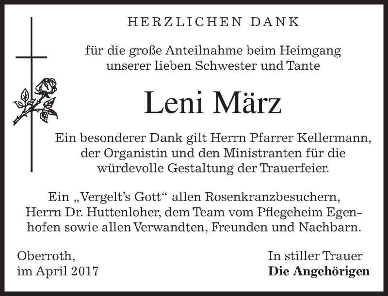Hier finden Sie alle Traueranzeigen aus der Zeitung, die bisher für Leni März erschienen sind. Weitere Traueranzeigen, die in der Zeitung erscheinen, werden hier ebenfalls aufgelistet