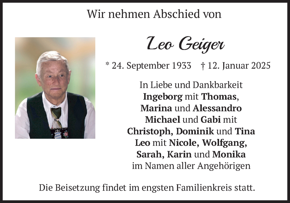 Hier finden Sie alle Traueranzeigen aus der Zeitung, die bisher für Leo Geiger erschienen sind. Weitere Traueranzeigen, die in der Zeitung erscheinen, werden hier ebenfalls aufgelistet