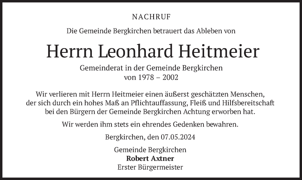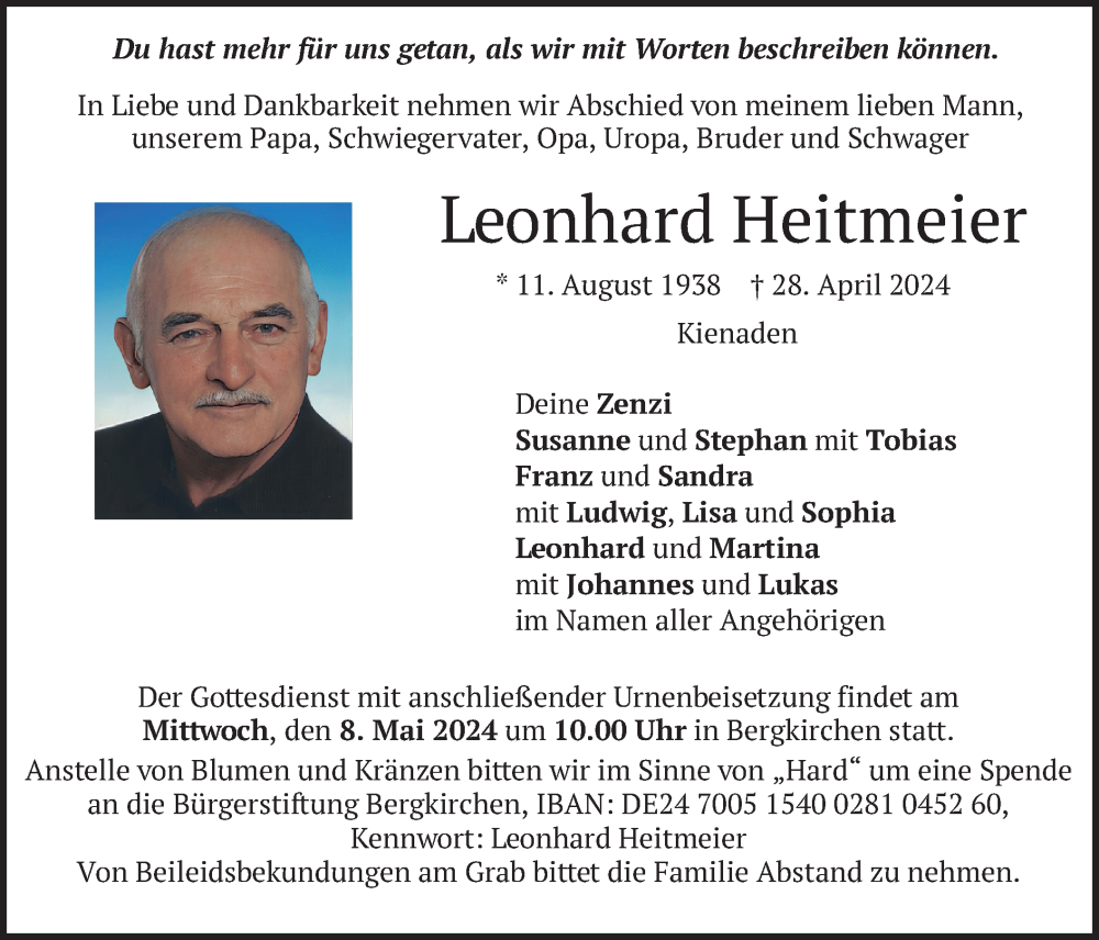 Hier finden Sie alle Traueranzeigen aus der Zeitung, die bisher für Leonhard Heitmeier erschienen sind. Weitere Traueranzeigen, die in der Zeitung erscheinen, werden hier ebenfalls aufgelistet