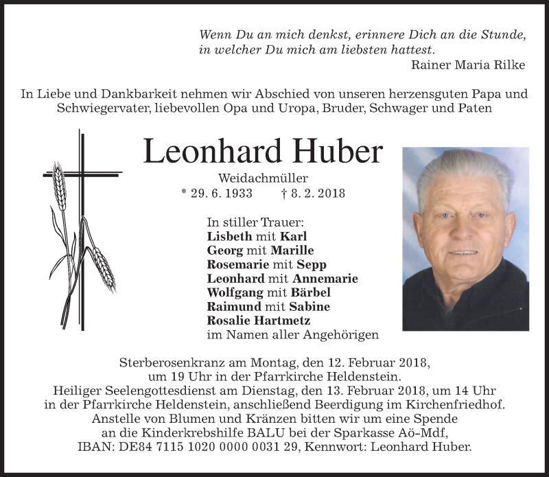 Hier finden Sie alle Traueranzeigen aus der Zeitung, die bisher für Leonhard Huber erschienen sind. Weitere Traueranzeigen, die in der Zeitung erscheinen, werden hier ebenfalls aufgelistet