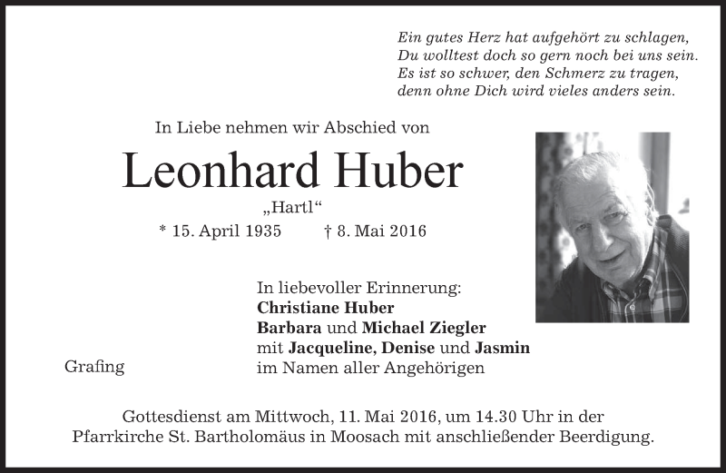 Hier finden Sie alle Traueranzeigen aus der Zeitung, die bisher für Leonhard Huber erschienen sind. Weitere Traueranzeigen, die in der Zeitung erscheinen, werden hier ebenfalls aufgelistet