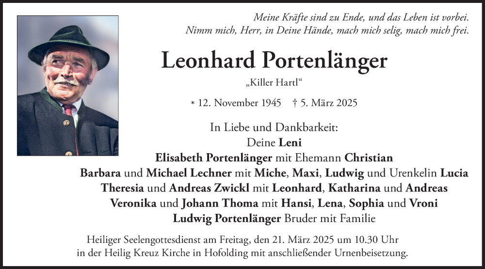 Hier finden Sie alle Traueranzeigen aus der Zeitung, die bisher für Leonhard Portenlänger erschienen sind. Weitere Traueranzeigen, die in der Zeitung erscheinen, werden hier ebenfalls aufgelistet