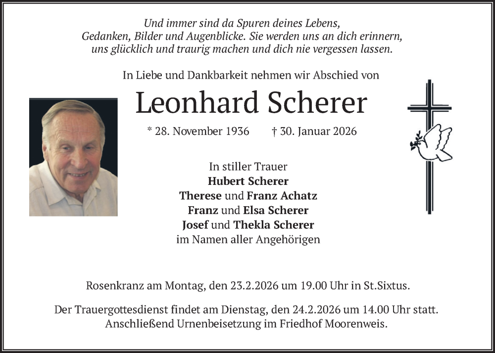 Hier finden Sie alle Traueranzeigen aus der Zeitung, die bisher für Leonhard Scherer erschienen sind. Weitere Traueranzeigen, die in der Zeitung erscheinen, werden hier ebenfalls aufgelistet