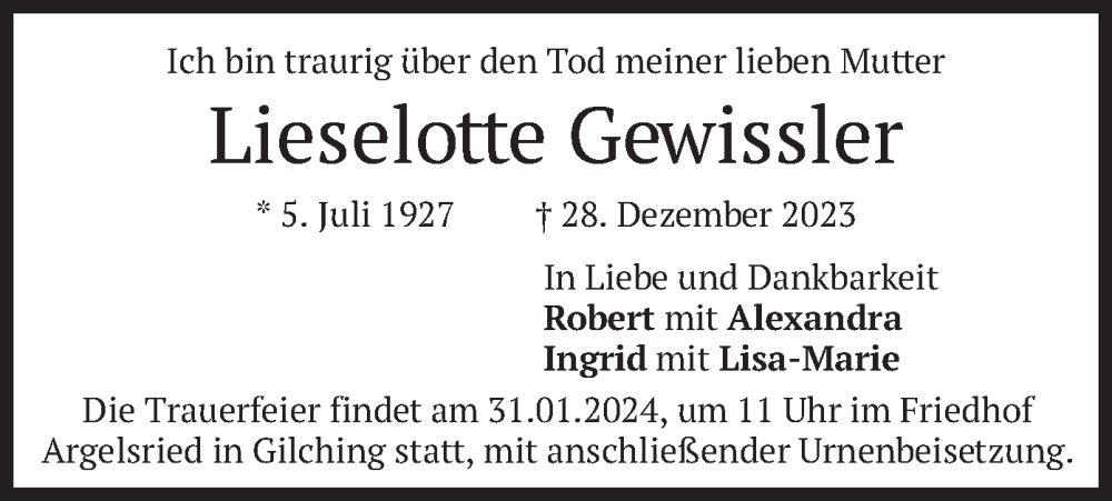 Hier finden Sie alle Traueranzeigen aus der Zeitung, die bisher für Lieselotte Gewissler erschienen sind. Weitere Traueranzeigen, die in der Zeitung erscheinen, werden hier ebenfalls aufgelistet