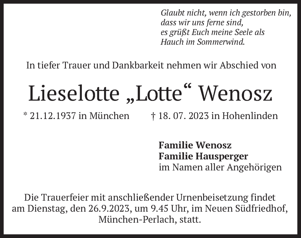 Hier finden Sie alle Traueranzeigen aus der Zeitung, die bisher für Lieselotte Wenosz erschienen sind. Weitere Traueranzeigen, die in der Zeitung erscheinen, werden hier ebenfalls aufgelistet