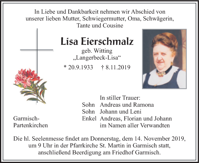 Hier finden Sie alle Traueranzeigen aus der Zeitung, die bisher für Lisa Eierschmalz erschienen sind. Weitere Traueranzeigen, die in der Zeitung erscheinen, werden hier ebenfalls aufgelistet