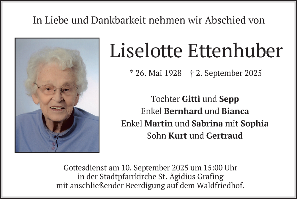 Hier finden Sie alle Traueranzeigen aus der Zeitung, die bisher für Liselotte Ettenhuber erschienen sind. Weitere Traueranzeigen, die in der Zeitung erscheinen, werden hier ebenfalls aufgelistet