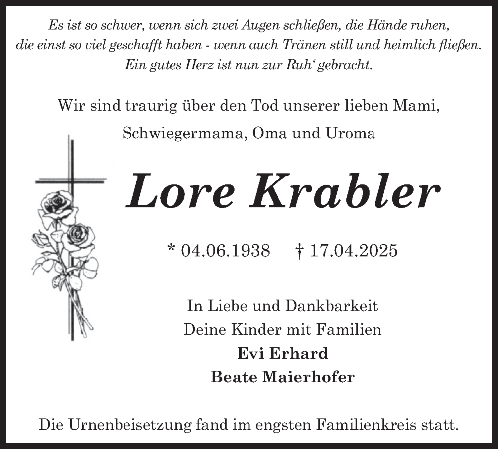Hier finden Sie alle Traueranzeigen aus der Zeitung, die bisher für Lore Krabler erschienen sind. Weitere Traueranzeigen, die in der Zeitung erscheinen, werden hier ebenfalls aufgelistet