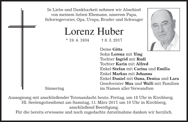 Hier finden Sie alle Traueranzeigen aus der Zeitung, die bisher für Lorenz Huber erschienen sind. Weitere Traueranzeigen, die in der Zeitung erscheinen, werden hier ebenfalls aufgelistet