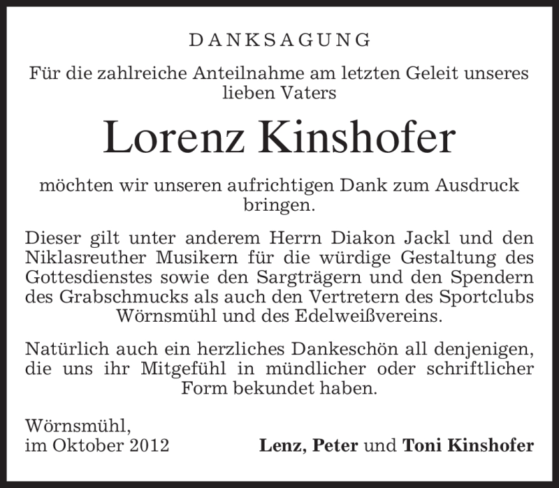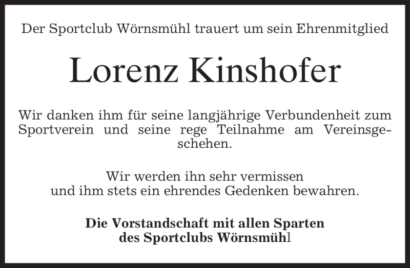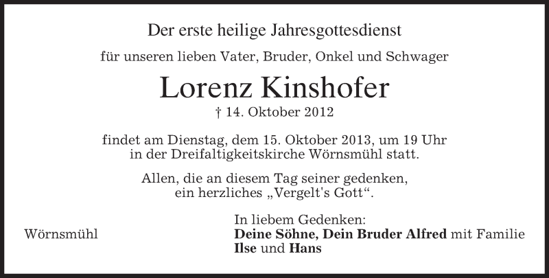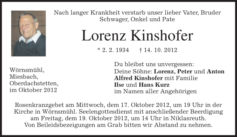 Hier finden Sie alle Traueranzeigen aus der Zeitung, die bisher für Lorenz Kinshofer erschienen sind. Weitere Traueranzeigen, die in der Zeitung erscheinen, werden hier ebenfalls aufgelistet