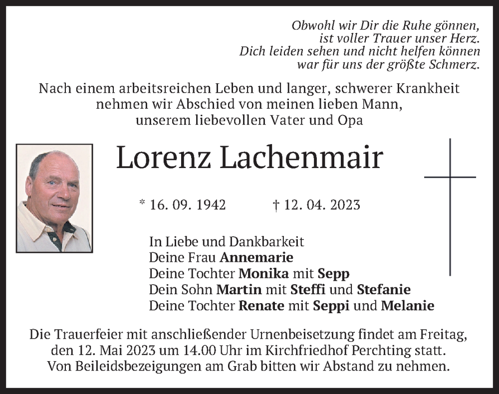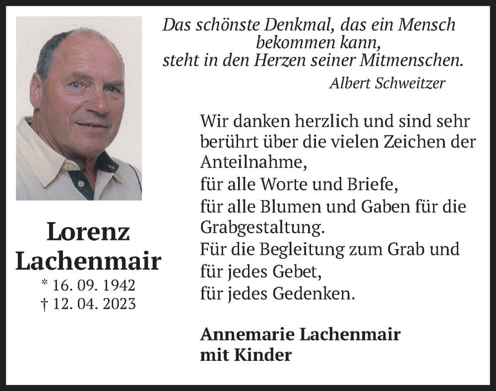 Hier finden Sie alle Traueranzeigen aus der Zeitung, die bisher für Lorenz Lachenmair erschienen sind. Weitere Traueranzeigen, die in der Zeitung erscheinen, werden hier ebenfalls aufgelistet