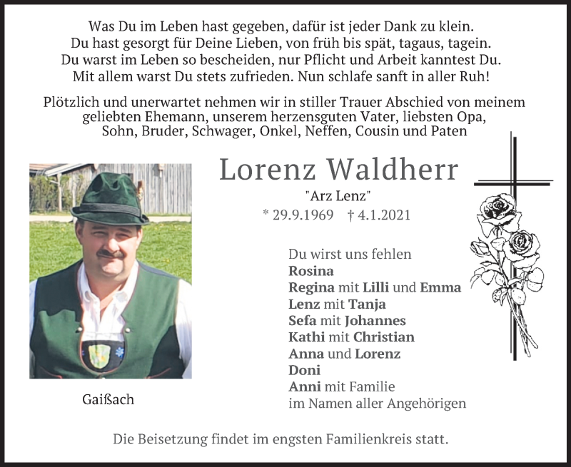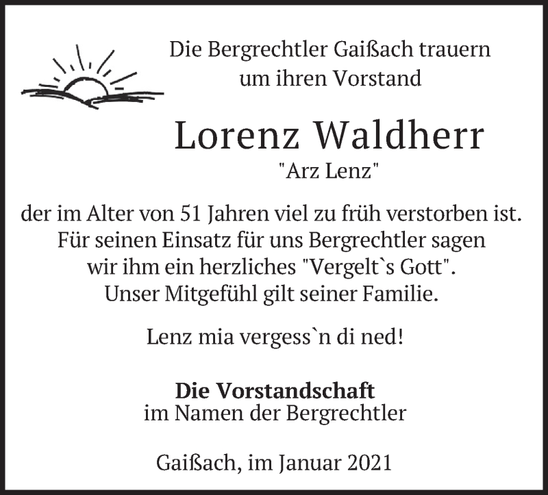 Hier finden Sie alle Traueranzeigen aus der Zeitung, die bisher für Lorenz Waldherr erschienen sind. Weitere Traueranzeigen, die in der Zeitung erscheinen, werden hier ebenfalls aufgelistet