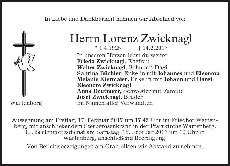 Hier finden Sie alle Traueranzeigen aus der Zeitung, die bisher für Lorenz Zwicknagl erschienen sind. Weitere Traueranzeigen, die in der Zeitung erscheinen, werden hier ebenfalls aufgelistet
