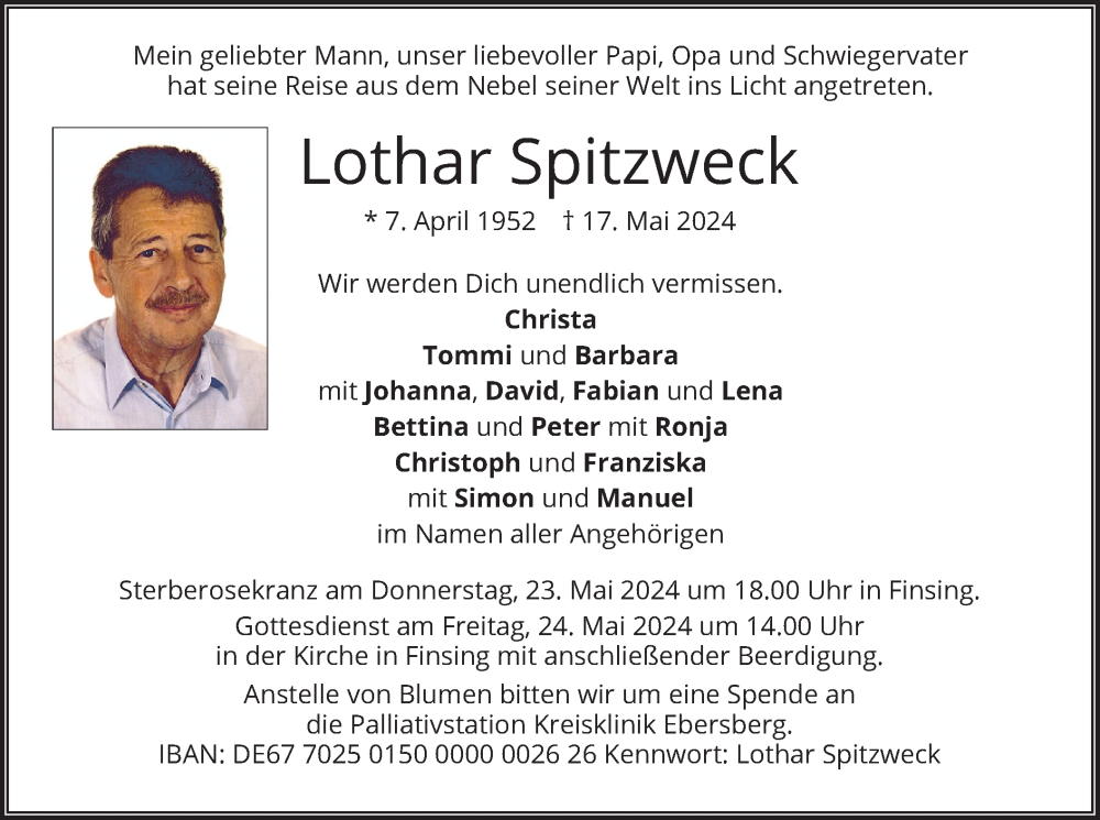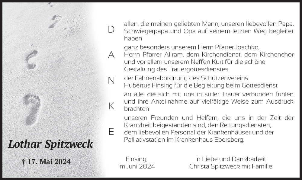 Hier finden Sie alle Traueranzeigen aus der Zeitung, die bisher für Lothar Spitzweck erschienen sind. Weitere Traueranzeigen, die in der Zeitung erscheinen, werden hier ebenfalls aufgelistet
