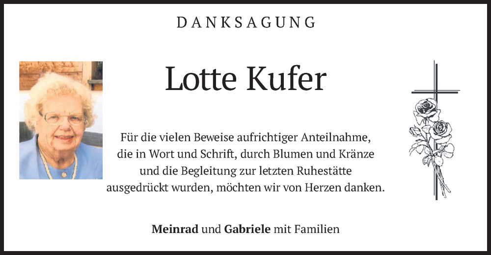Hier finden Sie alle Traueranzeigen aus der Zeitung, die bisher für Lotte Kufer erschienen sind. Weitere Traueranzeigen, die in der Zeitung erscheinen, werden hier ebenfalls aufgelistet