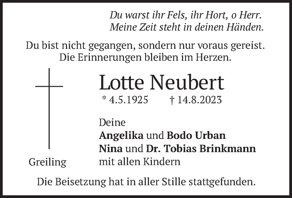 Hier finden Sie alle Traueranzeigen aus der Zeitung, die bisher für Lotte Neubert erschienen sind. Weitere Traueranzeigen, die in der Zeitung erscheinen, werden hier ebenfalls aufgelistet