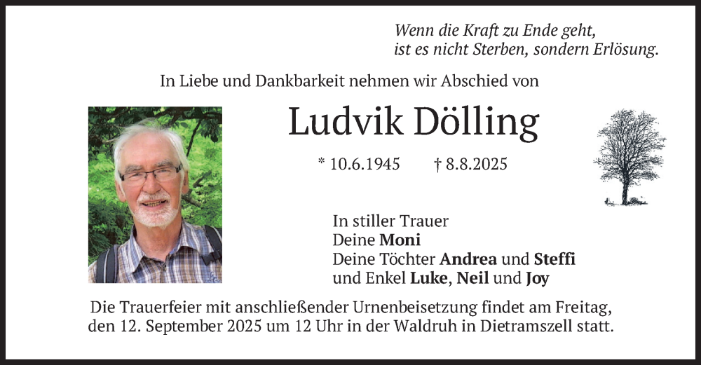 Hier finden Sie alle Traueranzeigen aus der Zeitung, die bisher für Ludvik Dölling erschienen sind. Weitere Traueranzeigen, die in der Zeitung erscheinen, werden hier ebenfalls aufgelistet