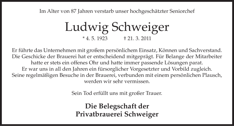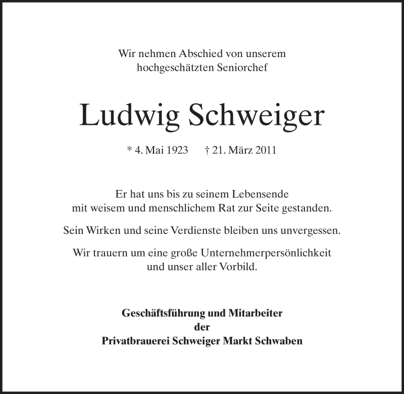 Hier finden Sie alle Traueranzeigen aus der Zeitung, die bisher für Ludwig Schweiger erschienen sind. Weitere Traueranzeigen, die in der Zeitung erscheinen, werden hier ebenfalls aufgelistet