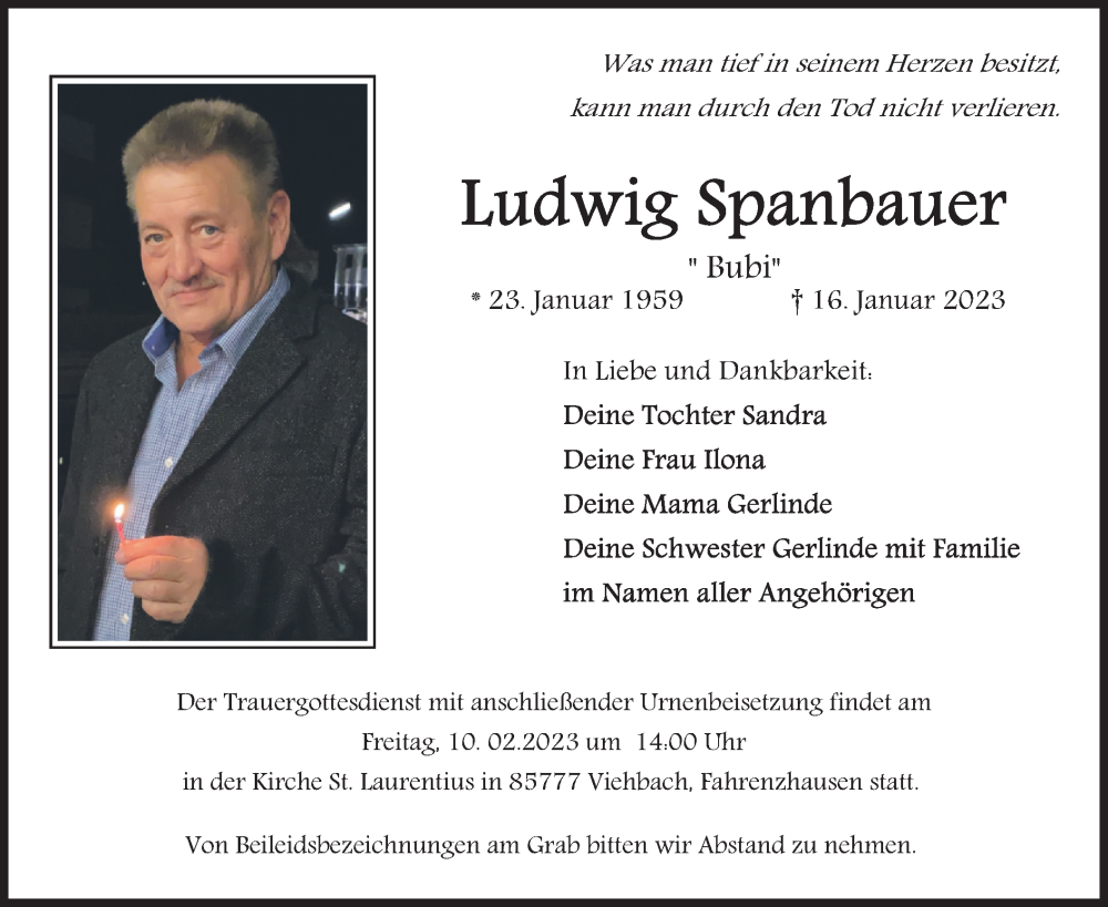 Hier finden Sie alle Traueranzeigen aus der Zeitung, die bisher für Ludwig Spanbauer erschienen sind. Weitere Traueranzeigen, die in der Zeitung erscheinen, werden hier ebenfalls aufgelistet