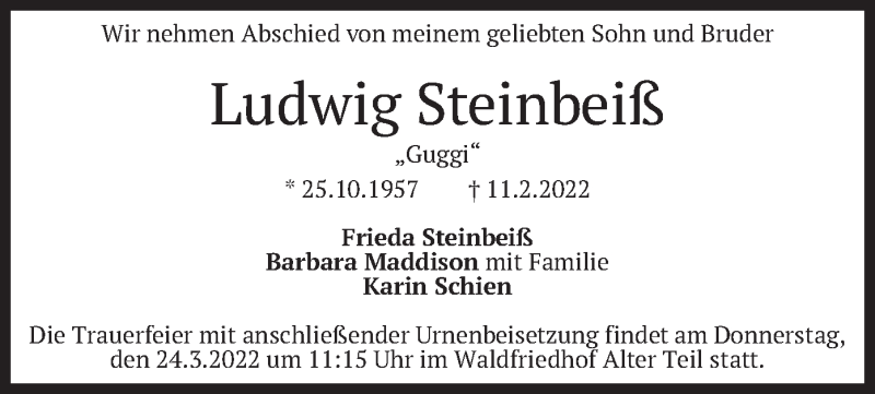 Hier finden Sie alle Traueranzeigen aus der Zeitung, die bisher für Ludwig Steinbeiß erschienen sind. Weitere Traueranzeigen, die in der Zeitung erscheinen, werden hier ebenfalls aufgelistet