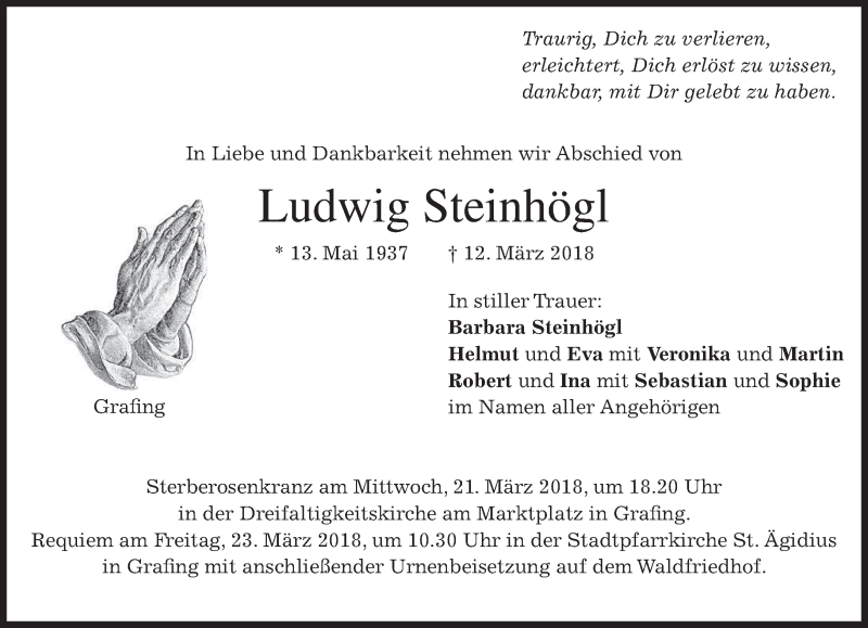 Hier finden Sie alle Traueranzeigen aus der Zeitung, die bisher für Ludwig Steinhögl erschienen sind. Weitere Traueranzeigen, die in der Zeitung erscheinen, werden hier ebenfalls aufgelistet