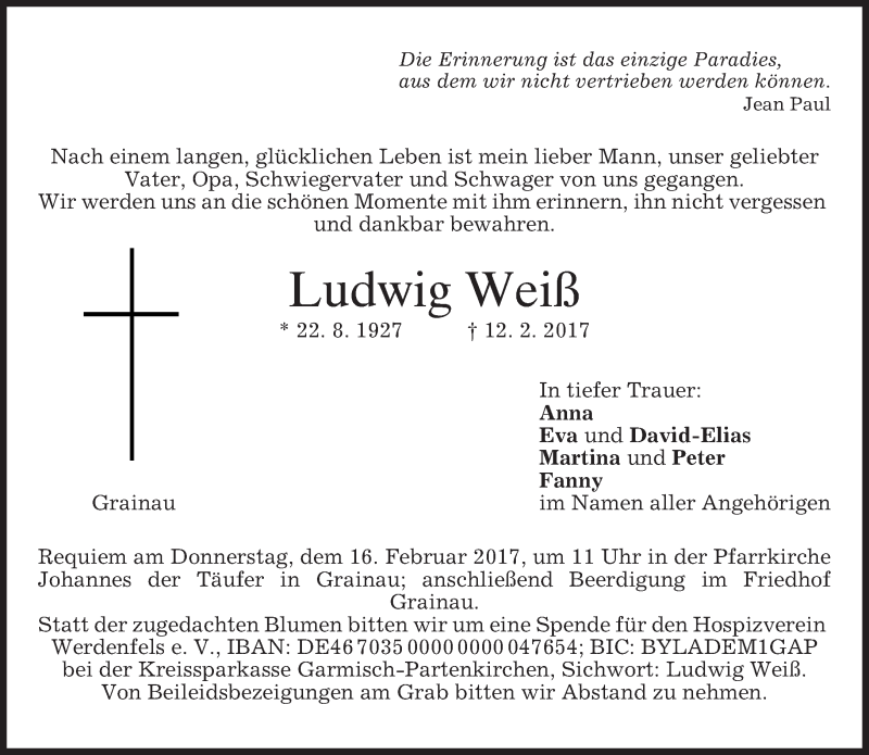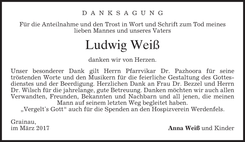 Hier finden Sie alle Traueranzeigen aus der Zeitung, die bisher für Ludwig Weiß erschienen sind. Weitere Traueranzeigen, die in der Zeitung erscheinen, werden hier ebenfalls aufgelistet