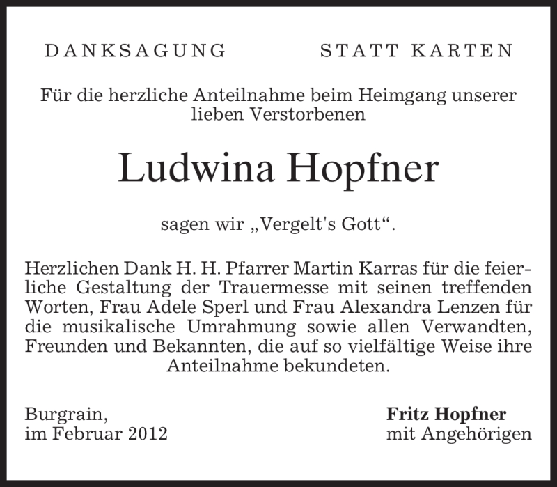 Hier finden Sie alle Traueranzeigen aus der Zeitung, die bisher für Ludwina Hopfner erschienen sind. Weitere Traueranzeigen, die in der Zeitung erscheinen, werden hier ebenfalls aufgelistet