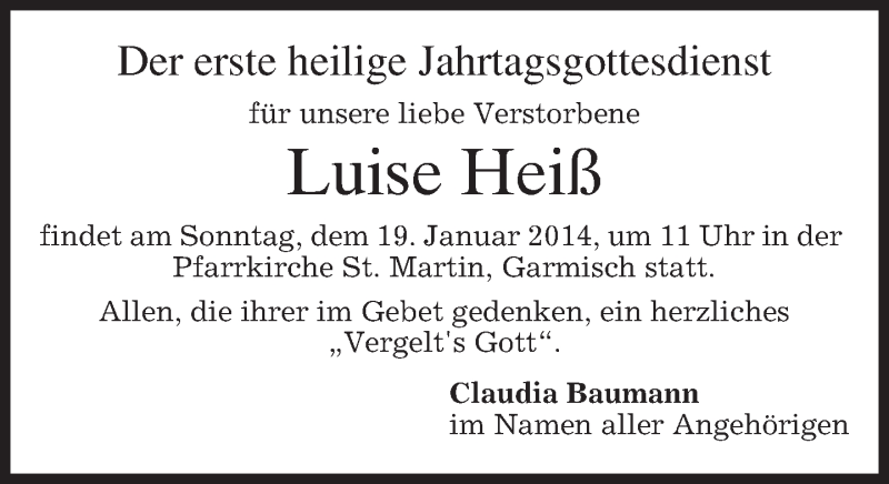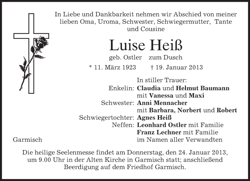 Hier finden Sie alle Traueranzeigen aus der Zeitung, die bisher für Luise Heiß erschienen sind. Weitere Traueranzeigen, die in der Zeitung erscheinen, werden hier ebenfalls aufgelistet