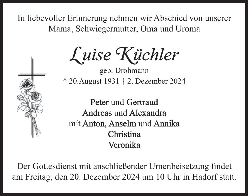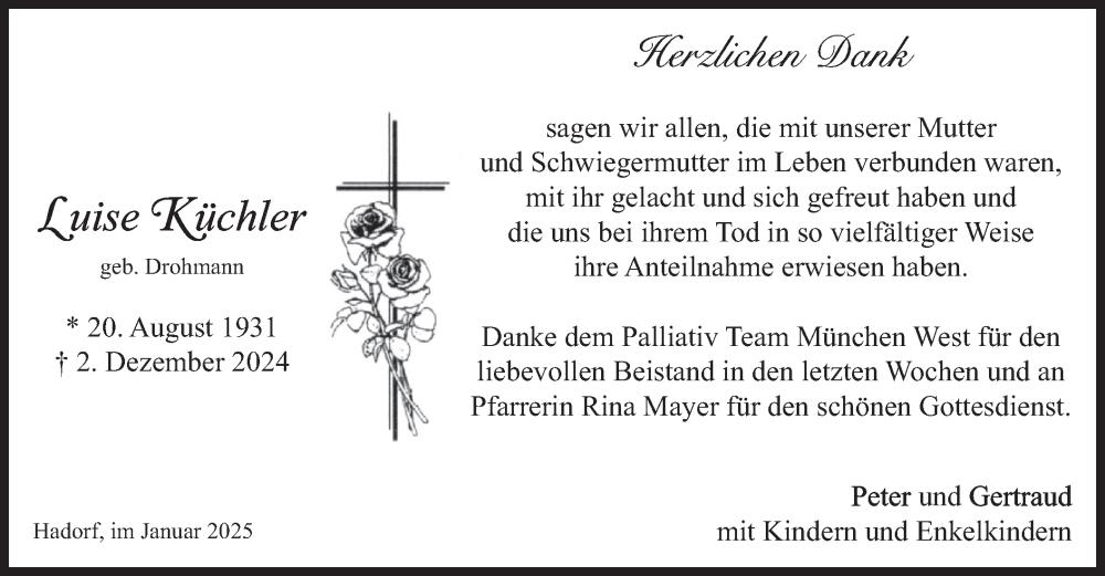 Hier finden Sie alle Traueranzeigen aus der Zeitung, die bisher für Luise Küchler erschienen sind. Weitere Traueranzeigen, die in der Zeitung erscheinen, werden hier ebenfalls aufgelistet