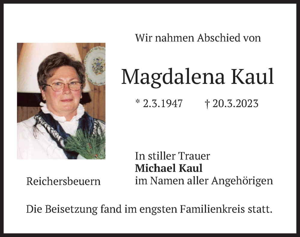 Hier finden Sie alle Traueranzeigen aus der Zeitung, die bisher für Magdalena Kaul erschienen sind. Weitere Traueranzeigen, die in der Zeitung erscheinen, werden hier ebenfalls aufgelistet