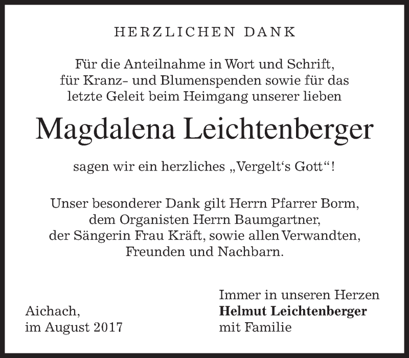 Hier finden Sie alle Traueranzeigen aus der Zeitung, die bisher für Magdalena Leichtenberger erschienen sind. Weitere Traueranzeigen, die in der Zeitung erscheinen, werden hier ebenfalls aufgelistet
