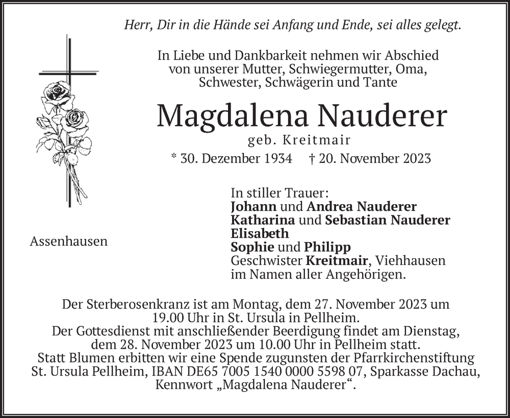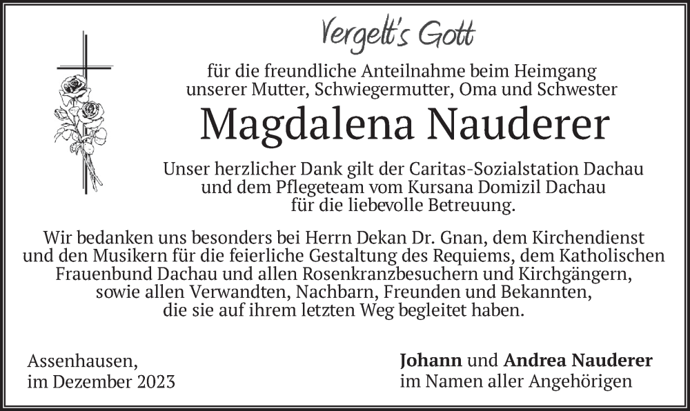 Hier finden Sie alle Traueranzeigen aus der Zeitung, die bisher für Magdalena Nauderer erschienen sind. Weitere Traueranzeigen, die in der Zeitung erscheinen, werden hier ebenfalls aufgelistet