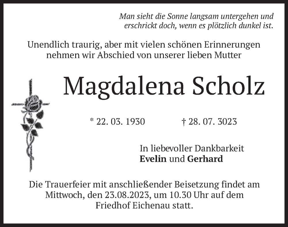 Hier finden Sie alle Traueranzeigen aus der Zeitung, die bisher für Magdalena Scholz erschienen sind. Weitere Traueranzeigen, die in der Zeitung erscheinen, werden hier ebenfalls aufgelistet