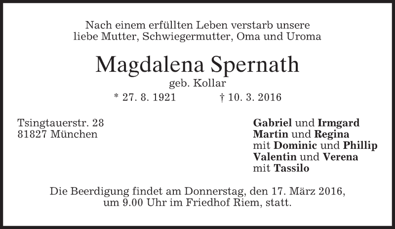 Hier finden Sie alle Traueranzeigen aus der Zeitung, die bisher für Magdalena Spernath erschienen sind. Weitere Traueranzeigen, die in der Zeitung erscheinen, werden hier ebenfalls aufgelistet