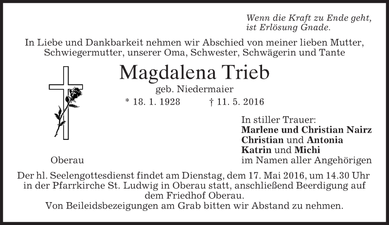Hier finden Sie alle Traueranzeigen aus der Zeitung, die bisher für Magdalena Trieb erschienen sind. Weitere Traueranzeigen, die in der Zeitung erscheinen, werden hier ebenfalls aufgelistet