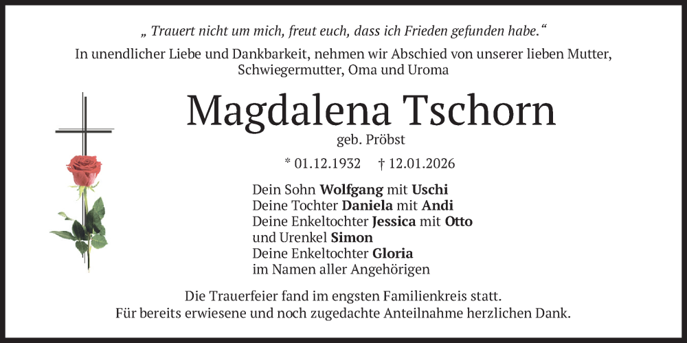 Hier finden Sie alle Traueranzeigen aus der Zeitung, die bisher für Magdalena Tschorn erschienen sind. Weitere Traueranzeigen, die in der Zeitung erscheinen, werden hier ebenfalls aufgelistet