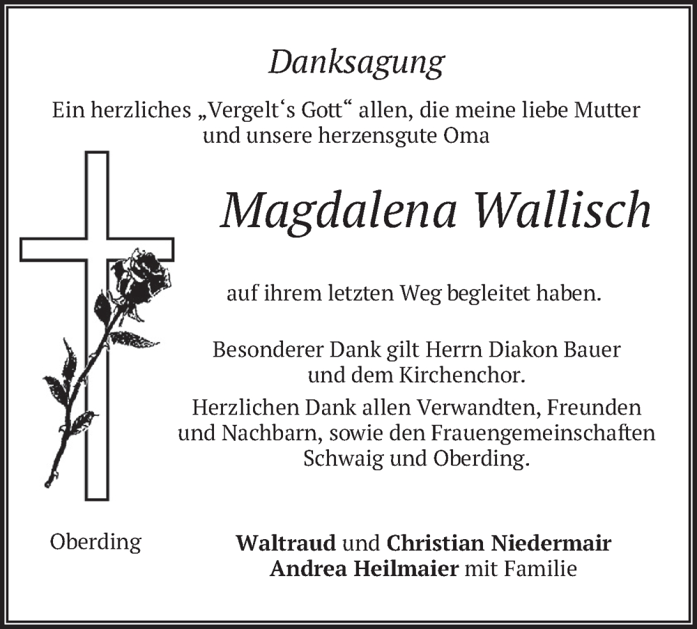 Hier finden Sie alle Traueranzeigen aus der Zeitung, die bisher für Magdalena Wallisch erschienen sind. Weitere Traueranzeigen, die in der Zeitung erscheinen, werden hier ebenfalls aufgelistet