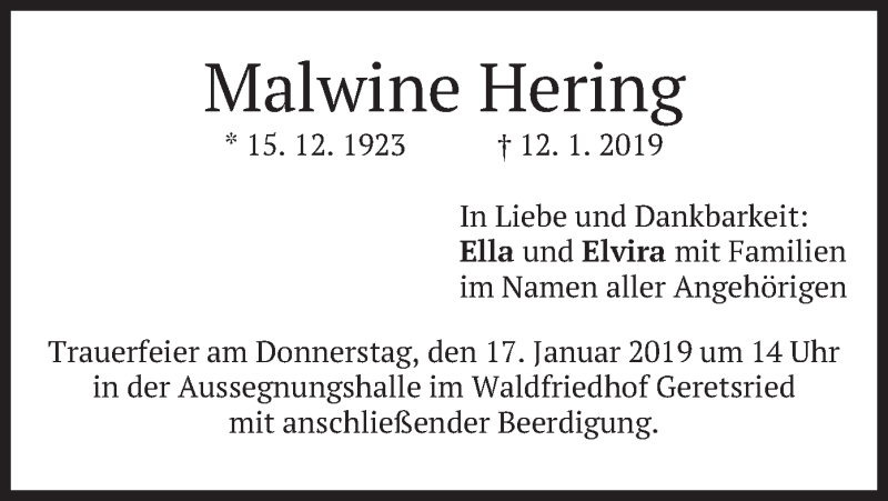 Hier finden Sie alle Traueranzeigen aus der Zeitung, die bisher für Malwine Hering erschienen sind. Weitere Traueranzeigen, die in der Zeitung erscheinen, werden hier ebenfalls aufgelistet