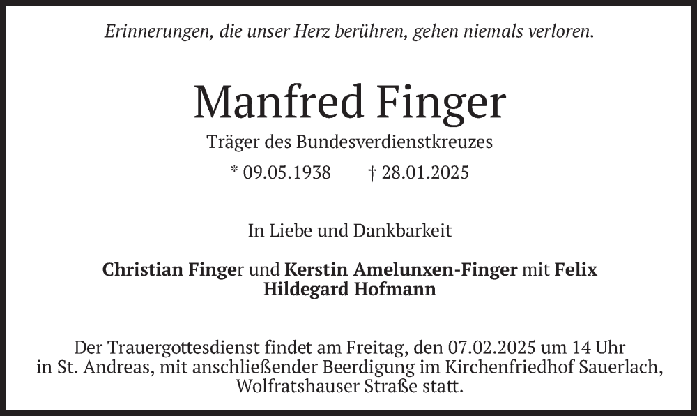 Hier finden Sie alle Traueranzeigen aus der Zeitung, die bisher für Manfred Finger erschienen sind. Weitere Traueranzeigen, die in der Zeitung erscheinen, werden hier ebenfalls aufgelistet