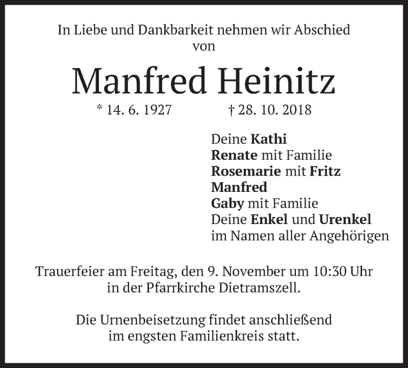 Hier finden Sie alle Traueranzeigen aus der Zeitung, die bisher für Manfred Heinitz erschienen sind. Weitere Traueranzeigen, die in der Zeitung erscheinen, werden hier ebenfalls aufgelistet