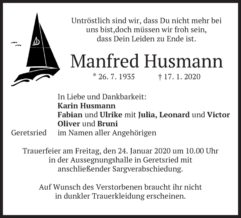 Hier finden Sie alle Traueranzeigen aus der Zeitung, die bisher für Manfred Husmann erschienen sind. Weitere Traueranzeigen, die in der Zeitung erscheinen, werden hier ebenfalls aufgelistet