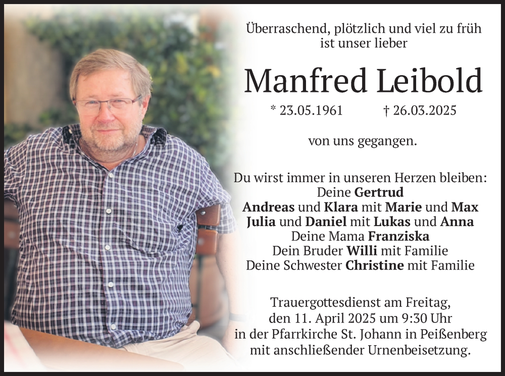Hier finden Sie alle Traueranzeigen aus der Zeitung, die bisher für Manfred Leibold erschienen sind. Weitere Traueranzeigen, die in der Zeitung erscheinen, werden hier ebenfalls aufgelistet