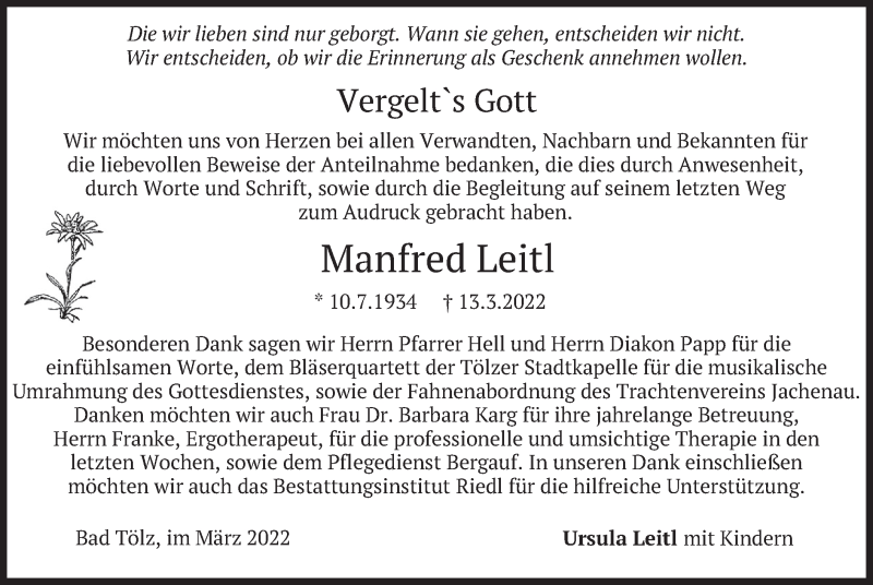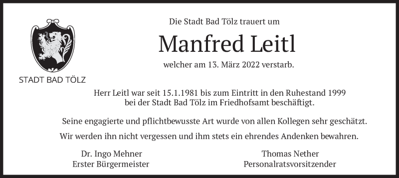 Hier finden Sie alle Traueranzeigen aus der Zeitung, die bisher für Manfred Leitl erschienen sind. Weitere Traueranzeigen, die in der Zeitung erscheinen, werden hier ebenfalls aufgelistet