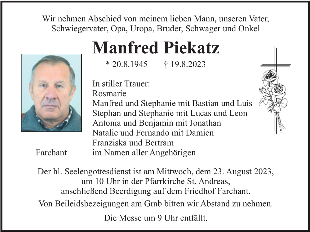 Hier finden Sie alle Traueranzeigen aus der Zeitung, die bisher für Manfred Piekatz erschienen sind. Weitere Traueranzeigen, die in der Zeitung erscheinen, werden hier ebenfalls aufgelistet