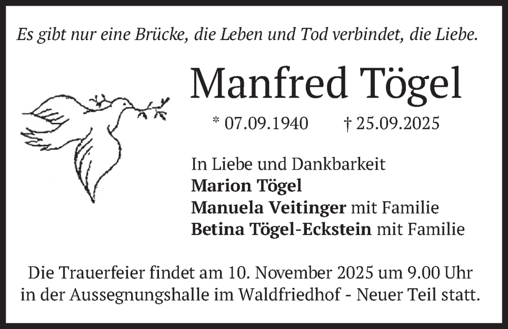 Hier finden Sie alle Traueranzeigen aus der Zeitung, die bisher für Manfred Tögel erschienen sind. Weitere Traueranzeigen, die in der Zeitung erscheinen, werden hier ebenfalls aufgelistet