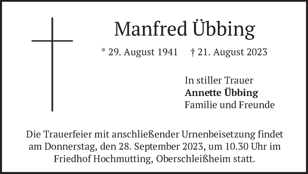 Hier finden Sie alle Traueranzeigen aus der Zeitung, die bisher für Manfred Übbing erschienen sind. Weitere Traueranzeigen, die in der Zeitung erscheinen, werden hier ebenfalls aufgelistet