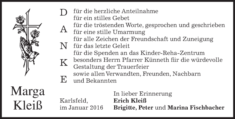 Hier finden Sie alle Traueranzeigen aus der Zeitung, die bisher für Marga Kleiß erschienen sind. Weitere Traueranzeigen, die in der Zeitung erscheinen, werden hier ebenfalls aufgelistet